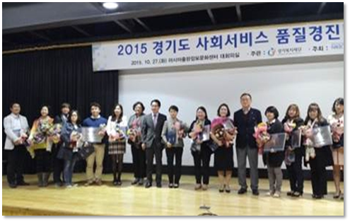 경기도 지역사회서비스 지원단이 주관한 2015년 경기도 사회서비스(바우처) 품질경진 대회 우수제공기관 시상식을 마치고 촬영한 기념사진입니다. 참사랑 일산덕양센터와 파주교하센터는 서비스 품질 부문에서 우수제공기관으로 선정되어 상을 수상했습니다.