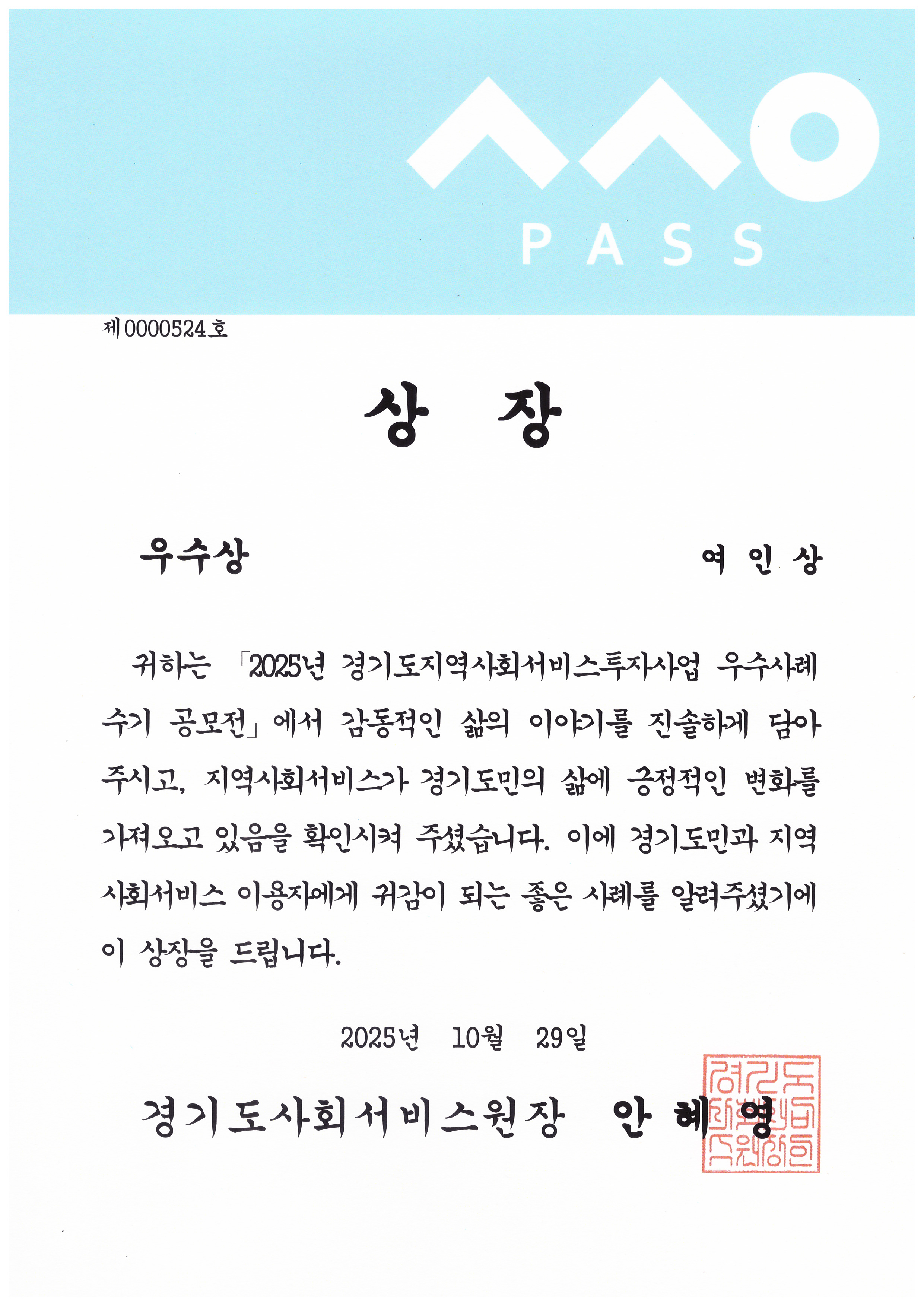 참사랑아동발달상담센터 파주교하센터가 ‘2025년 경기도 사회서비스 우수운영사례 공모전’에서 우수상을 받았습니다.